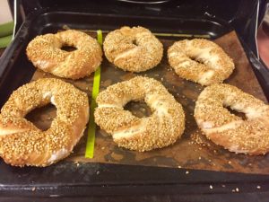 今月のパンはトルコパンのシミットです。今日の教室では入間農園の新鮮野菜を使い、メネメン(トルコ風スクランブルエッグ)と白ナスのオリーブオイル和えを作りました。