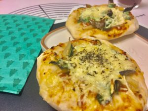 ピザにはあえてエメンタールチーズを使い、さっぱりと仕上げています。トッピングはヤーコンやケール、ネギなどのスーパーヘルシーなビタミン野菜。ピザソースはミニトマトを煮詰めて作った青ねこ特製。唐辛子をちょっと多めに入れたピリッとソースにしましたのでグリューワインにもぴったりです。