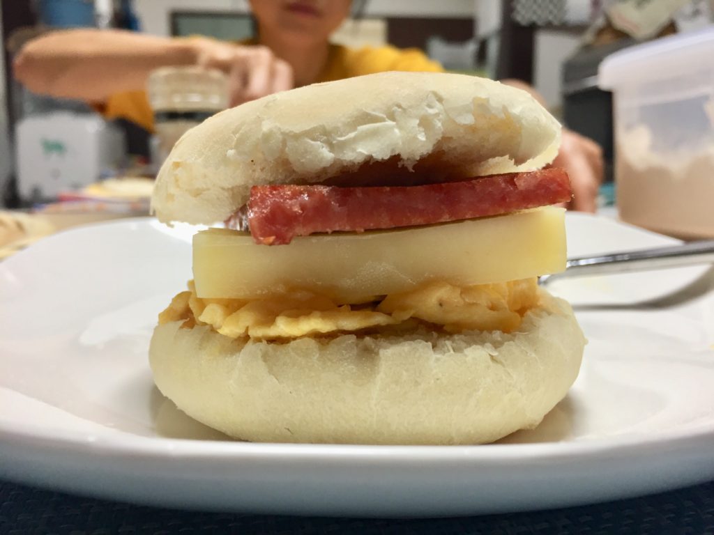 挟む具材としては、スパムとテティージャチーズ、スクランブルエッグなのですが、たまにはスパムも良いわねーと評判も上々です(ちょっとカロリーオーバーなんですけどね)。あのハワイでよくコンビニで売ってるスパムむすびのスパムです。