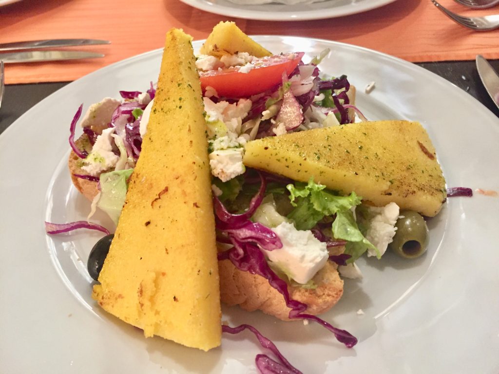 『ポレンタ」です。今回は香ばしく焼いてランチサラダにぴったりな一品にしたいのです。クロアチアのドブロブニクで非常にさっぱりしたベジタリアンメニューとして頂きまして、美味ですごくヘルシーだったので是非再現させたいと思っています。