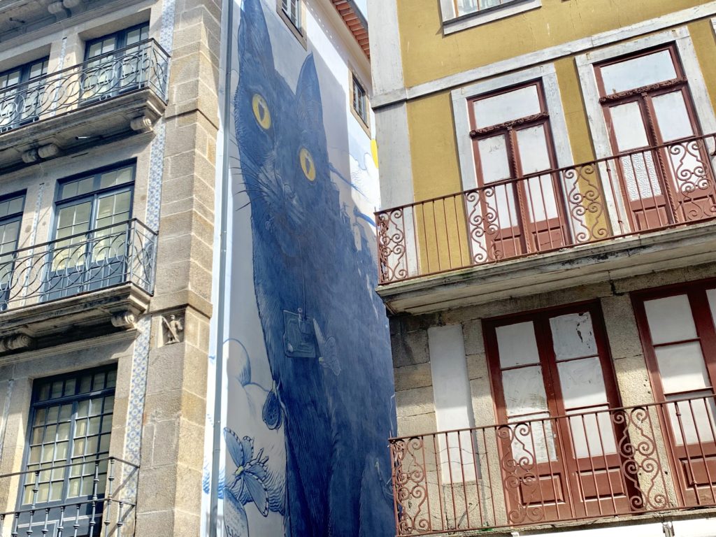 世界一美しい本屋さんのレロ書店からサンフランシスコ教会までの間、フローレス通りに入ったところの建物の壁に巨大な青ねこの壁画が描かれていたのです。