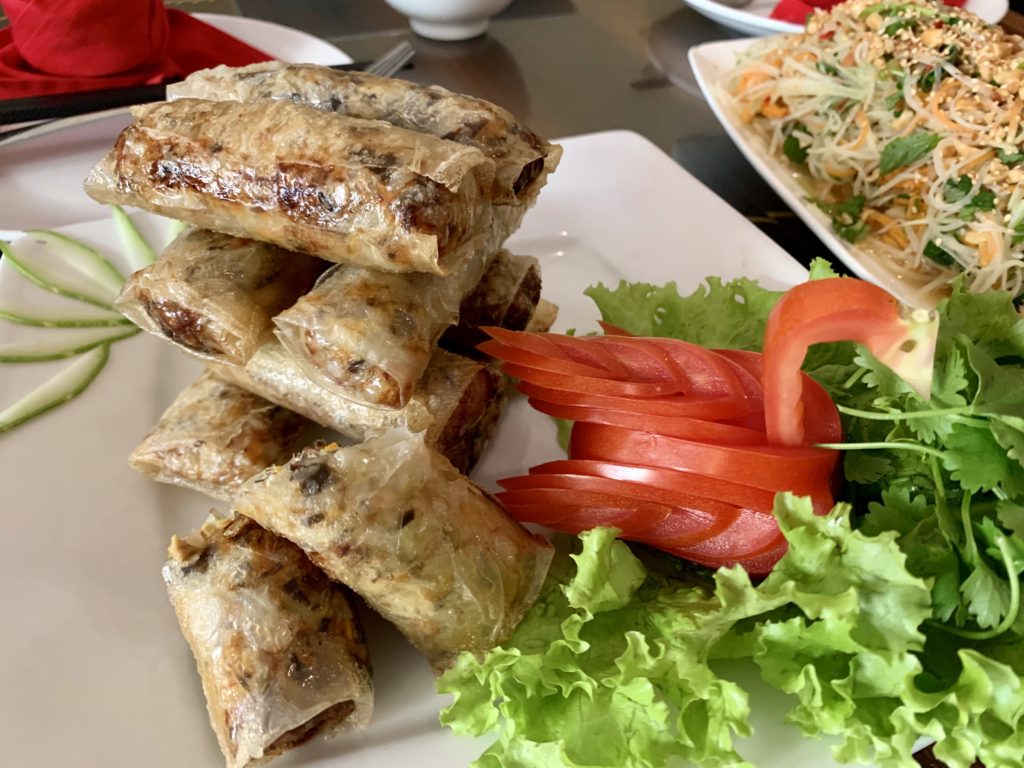 料理教室で作った揚げ春巻き、パパイヤサラダ、チキンの香草炒めも簡単で超絶美味!!シェフも素朴で親切。市場で食材を選ぶところから始まり、活気ある市場の様子も見ることができるのでオススメです。英語対応がほとんどですが、日本語のアシスタント付きのところもあるので安心ですよ。